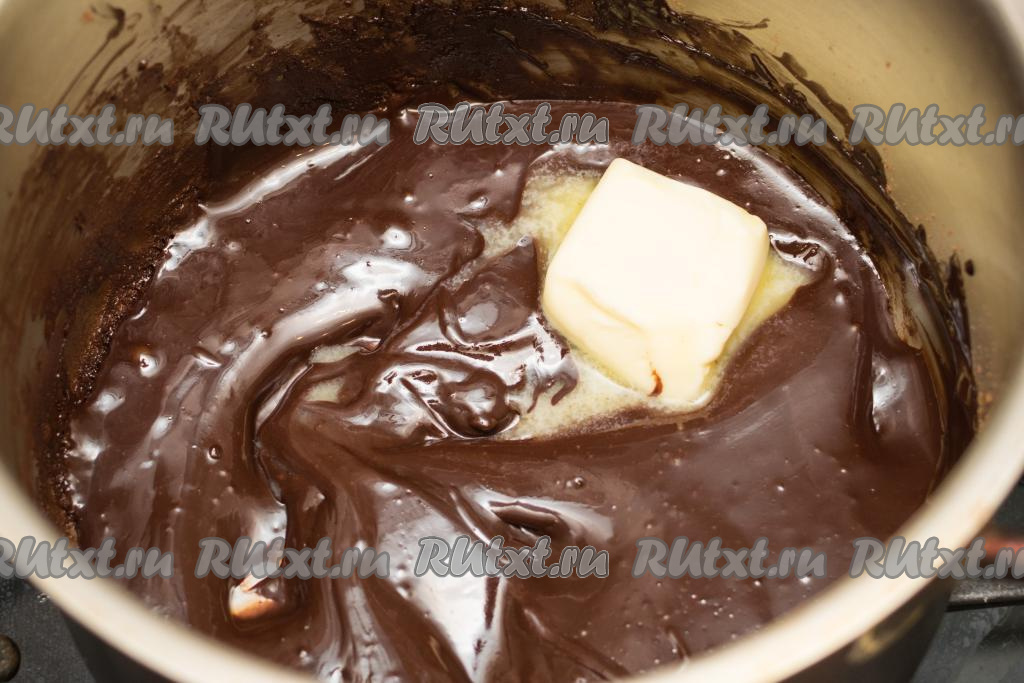 Добавить сливочное масло и прогреть помадку, постоянно перемешивая, до полного растворения масла. Убрать готовую шоколадную помадку с огня. Она будет блестящей, в меру густой.