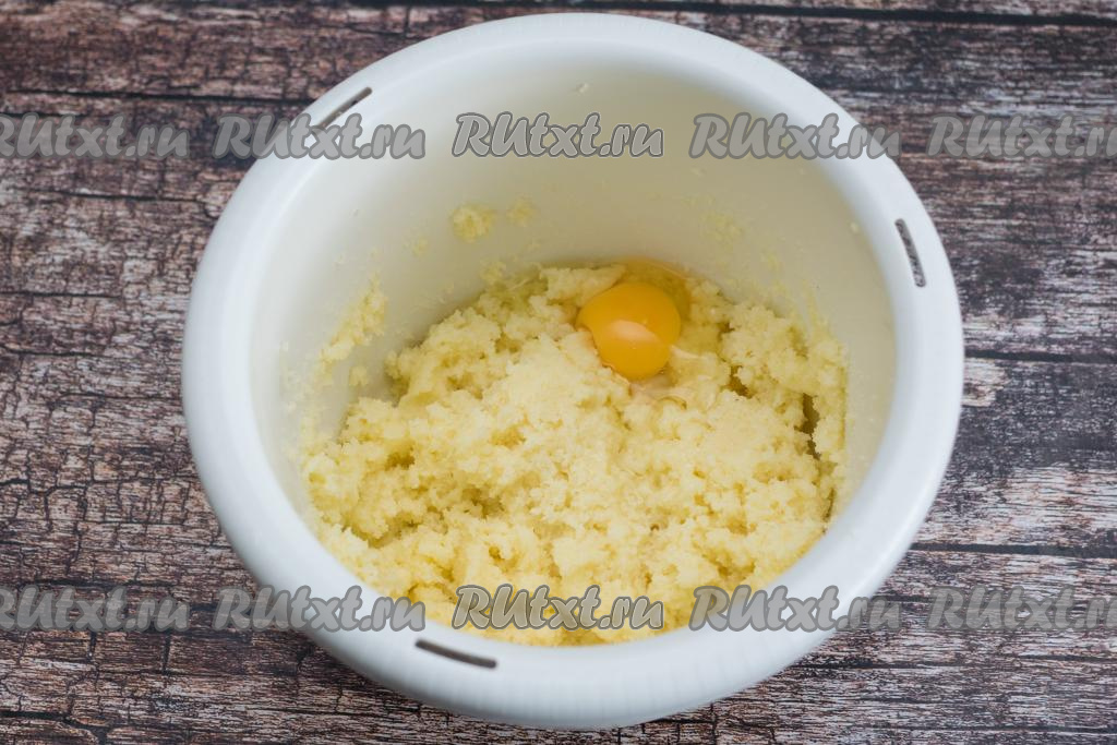 При помощи миксера смешать сахар с маслом до получения однородной массы. На перемешивание потребуется несколько минут, масляная масса должна хорошо смешаться с сахаром. Затем начать по одному добавлять в чашу сырые яйца, тщательно перемешивая массу миксером после добавления каждого яйца. Как только масса становится однородной, только после этого нужно добавлять следующее яйцо.