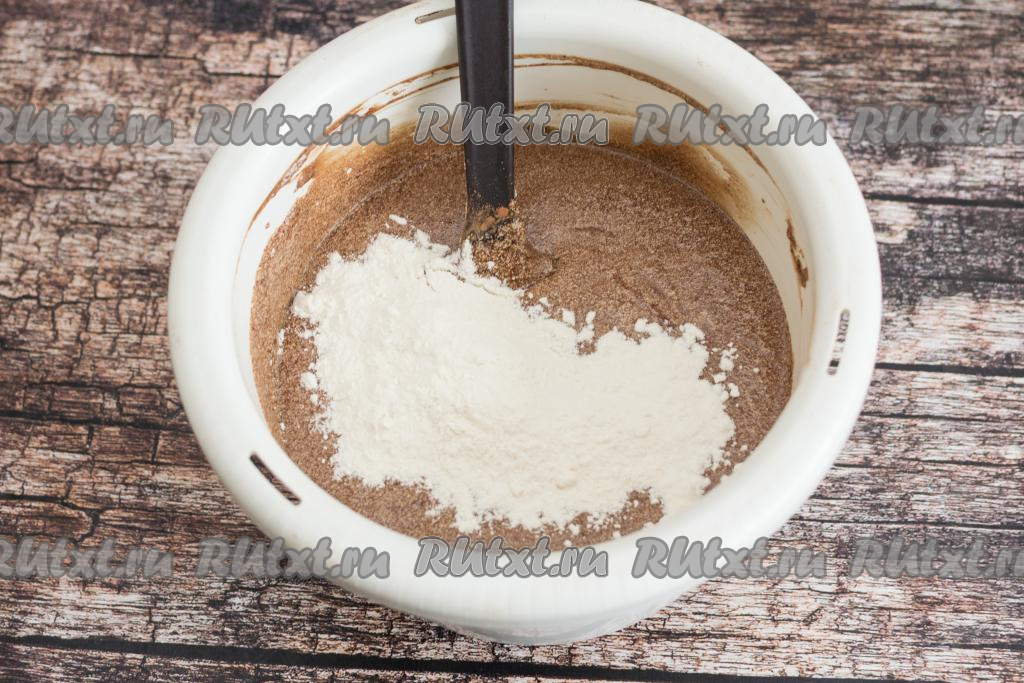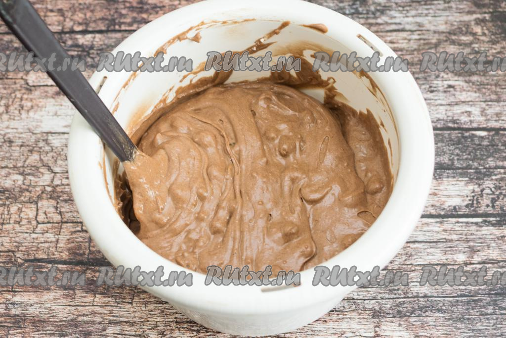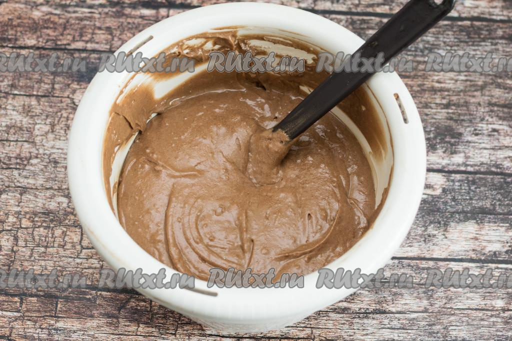 Начать небольшими порциями подсыпать муку, каждый раз перемешивая шоколадное тесто до однородности.