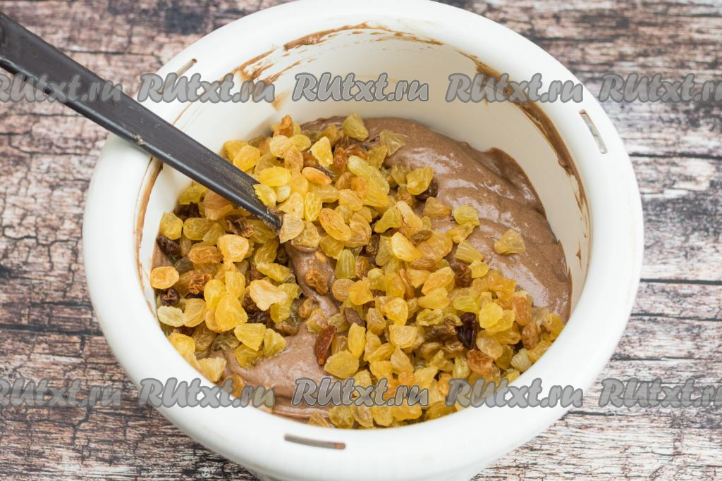 Аккуратно лопаткой вмешать изюм в тесто.