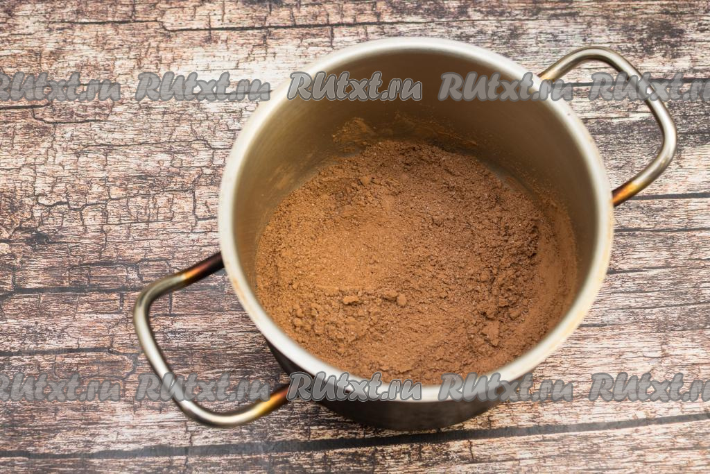 Готовые куличи полностью остудить и только потом можно заняться украшением. Я для украшения шоколадных бездрожжевых куличей сделала шоколадную помадку. Для приготовления помадки в небольшой кастрюле с достаточно толстым дном нужно смешать сахар и какао.