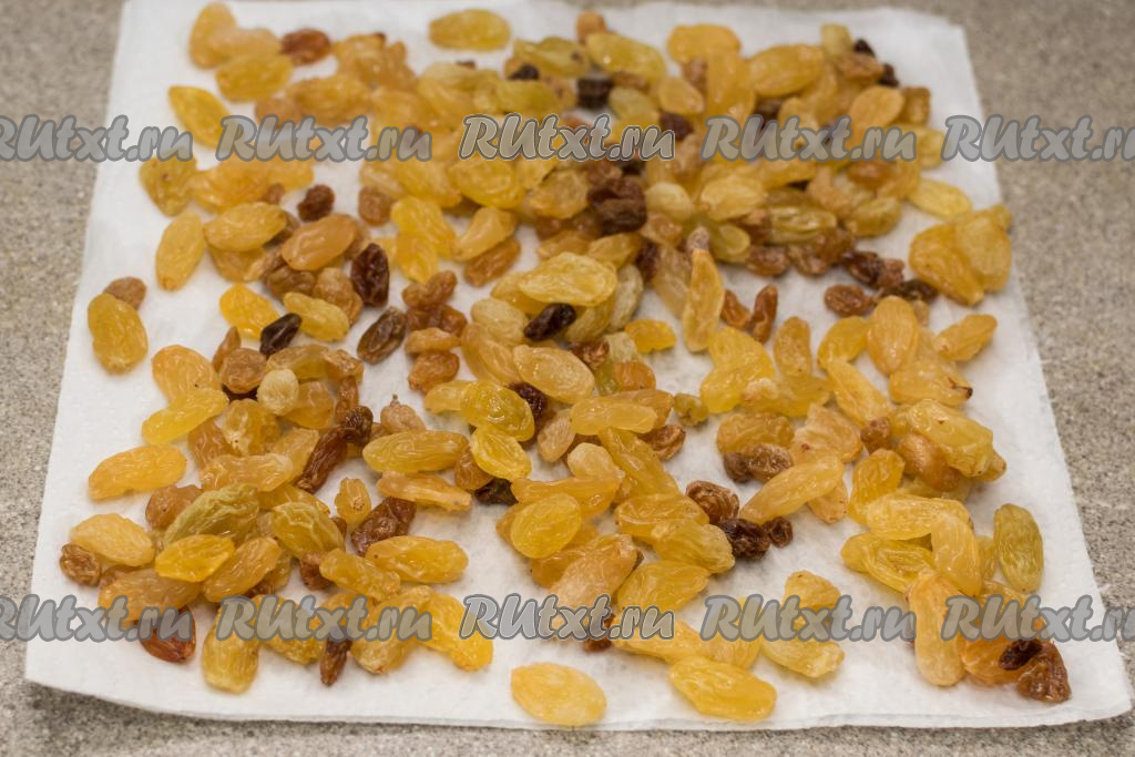 Затем откинуть распарившийся изюм на сито, промыть водой. Дать лишней воде с изюма стечь. После этого разложить его на бумажном полотенце, чтобы он обсох. В процессе обсыхания изюма осмотреть его, если на изюминках есть остатки веточек, их нужно будет убрать.