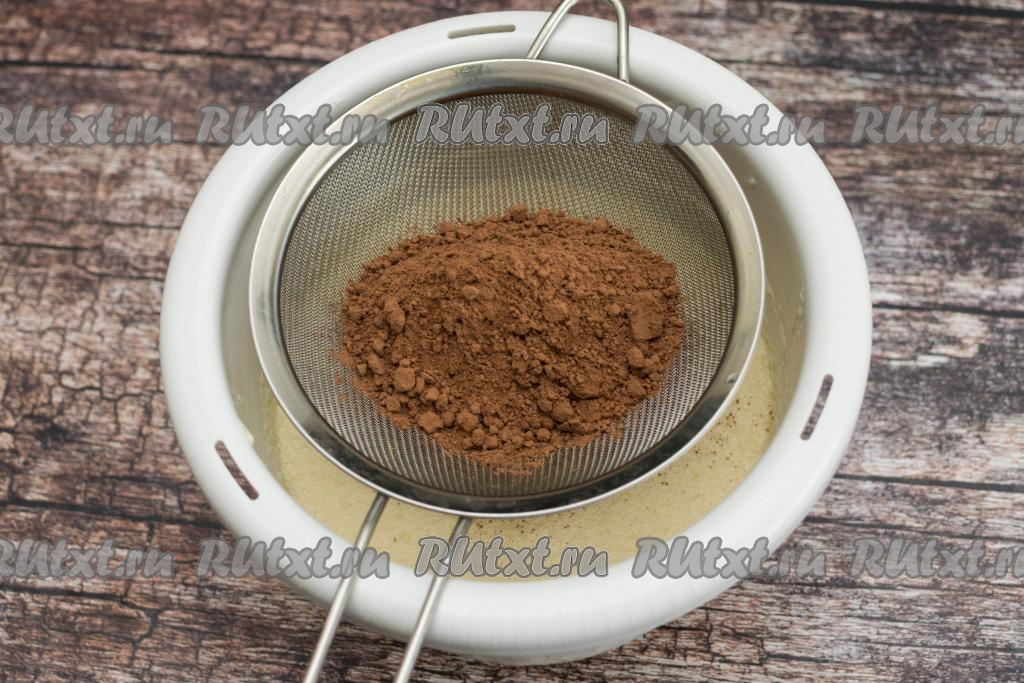 В получившуюся массу просеять какао. Затем перемешать получившуюся шоколадную массу лопаткой (или столовой ложкой) до однородности.