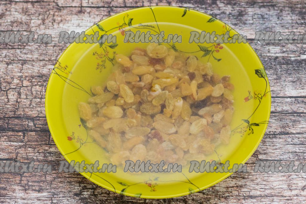 Прежде всего подготовим изюм. Его нужно будет промыть водой, затем переложить в глубокую тарелку, залить полностью кипящей водой и оставить распариваться на 5-7 минут.
