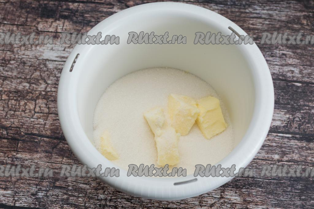 Пока сода гасится в кефире, не теряя времени, в глубокую чашу для взбивания миксером нужно выложить размягчившееся сливочное масло, нарезанное на кубики, затем всыпать сахар.