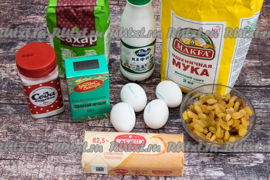 Подготовить продукты для приготовления шоколадного кулича без дрожжей. Кефир лучше взять жирностью от 2,5% и выше. Сливочное масло берите качественное, от проверенного производителя, жирностью не менее 82,5%. От качества масла во многом зависит вкус этой выпечки. Масло следует заранее достать из холодильника, чтобы оно согрелось и стало достаточно мягким.