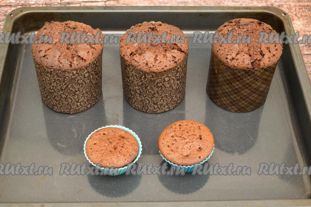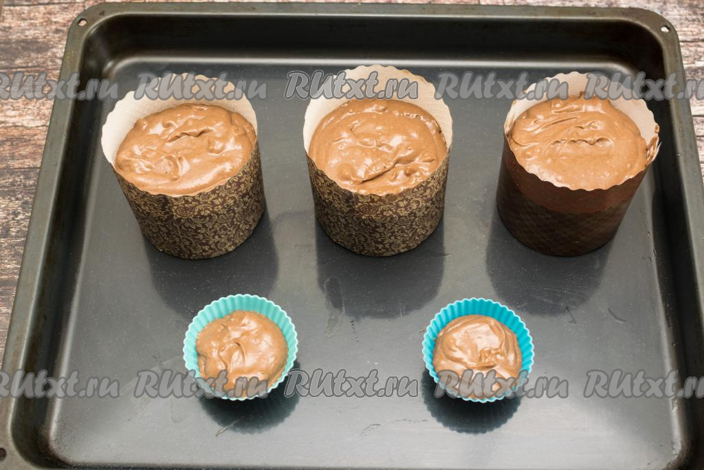 Разложить шоколадное тесто для куличей по бумажным формам, заполняя формы не более, чем на 2/3 высоты. Я заполнила 3 формы диаметром 9 сантиметров, остатки теста я разложила в две силиконовые формочки для маффинов. Формы с тестом поставить на противень.