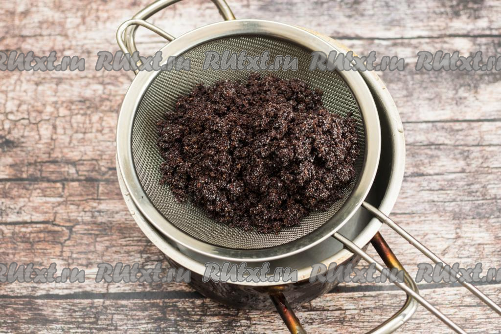 По прошествии 5 минут выключить огонь, накрыть кастрюлю крышкой и оставить мак набухать на 30-35 минут. Затем откинуть мак на сито и подождать 4-5 минут, чтобы стекла вся вода.