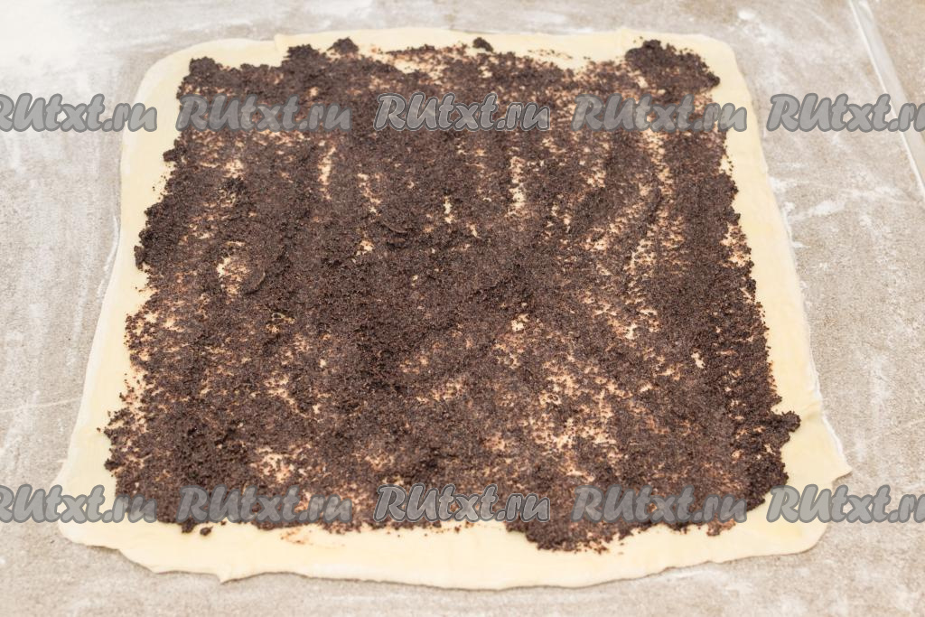 Затем при помощи чайной ложки распределить по тесту половину маковой начинки, отступив от краёв теста примерно 1,5-2 сантиметра.