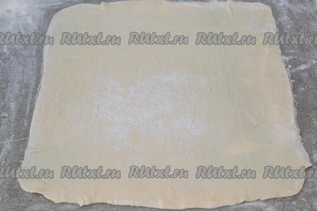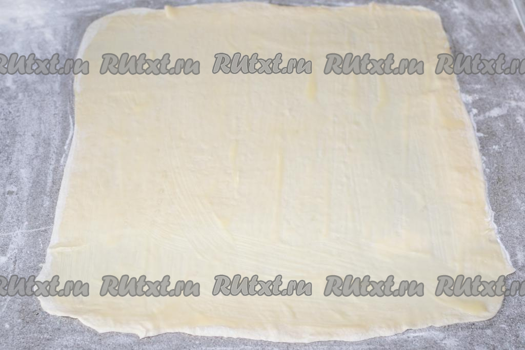 Сливочное масло растопить до жидкого состояния, дать ему немного остыть. Слоёное тесто у меня было в двух пластах. Вначале один пласт размороженного слоёного теста выложить на рабочую поверхность, присыпанную мукой, и раскатать в прямоугольник толщиной примерно 2 миллиметра.