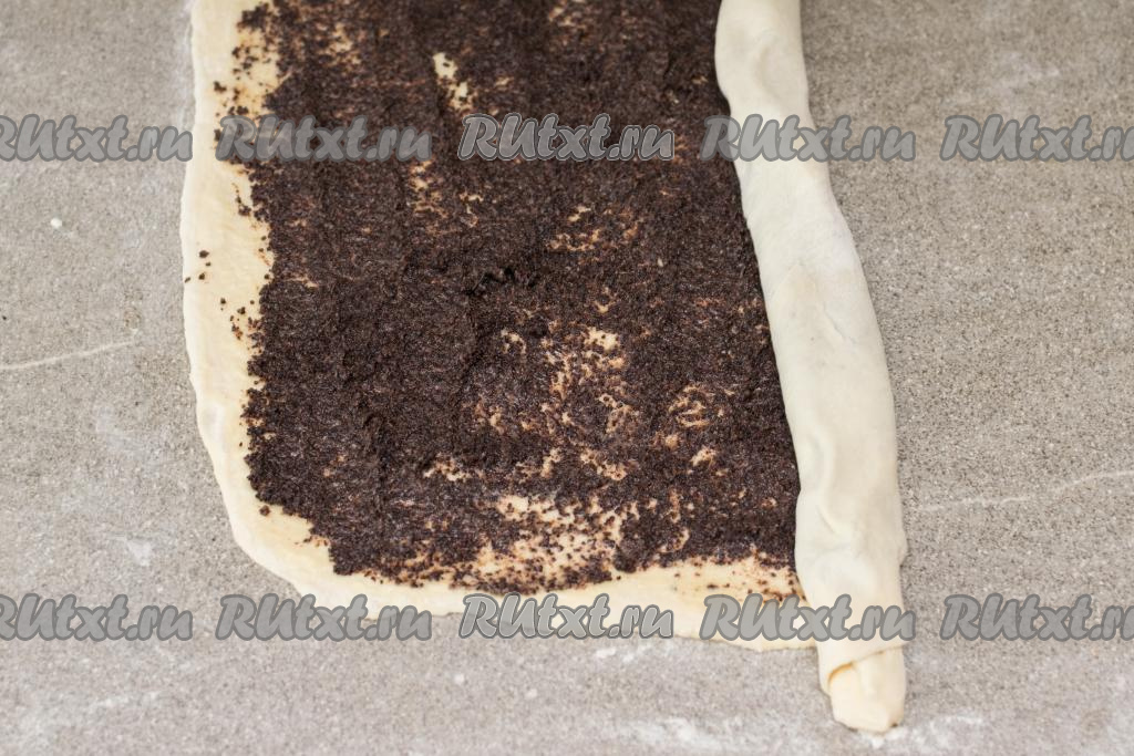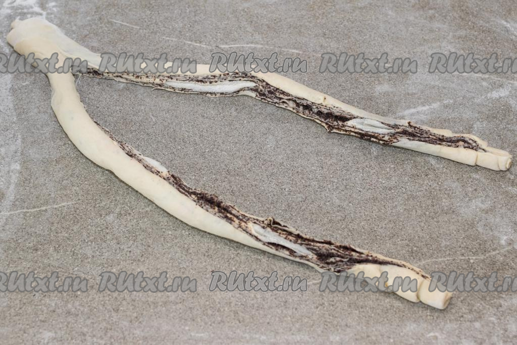 Взять вначале один край рулета и свернуть его в улитку так, чтобы маковая начинка смотрела наружу. Затем взять второй край рулета и тоже свернуть его в улитку, чтобы начинка смотрела наружу. У нас получится 2 улитки, как на фото.