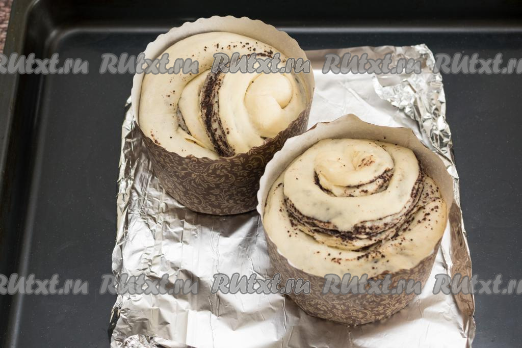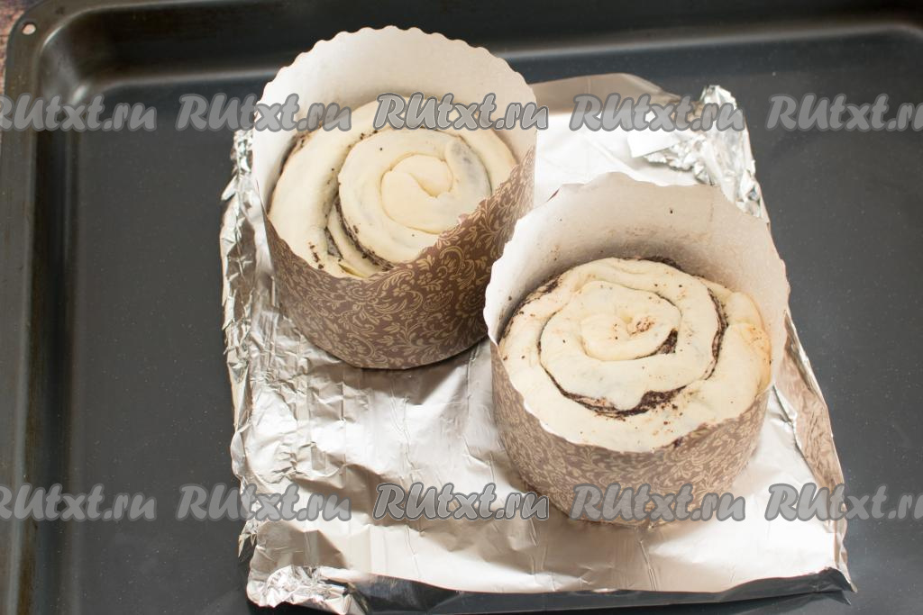 Накрыть бумажные формы сверху полотенцем и поставить прямо на противне в тёплое место на 1-1,5 часа для подъёма. Поднявшееся тесто должно практически полностью заполнить формы. У меня тесто хорошо поднялось уже через час.