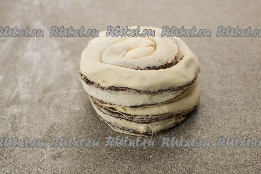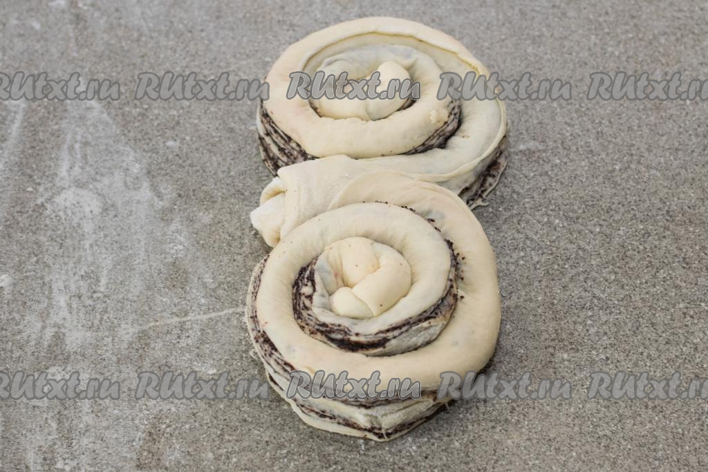 Затем поставить одну улитку на другую. Вот такая заготовка кулича "Краффин" из слоёного теста с маком получилась. Аналогично сформировать второй маковый кулич.