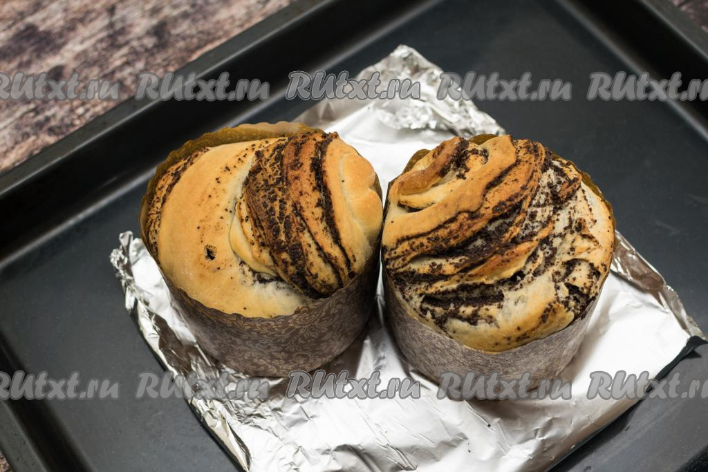 Противень для выпечки застелить фольгой, так как во время выпечки масло может вытекать из куличей. Куличи поместить в бумажные формы диаметром 11 сантиметров. Тесто должно занимать формы примерно на половину объёма. Поставить формы на противень с фольгой.