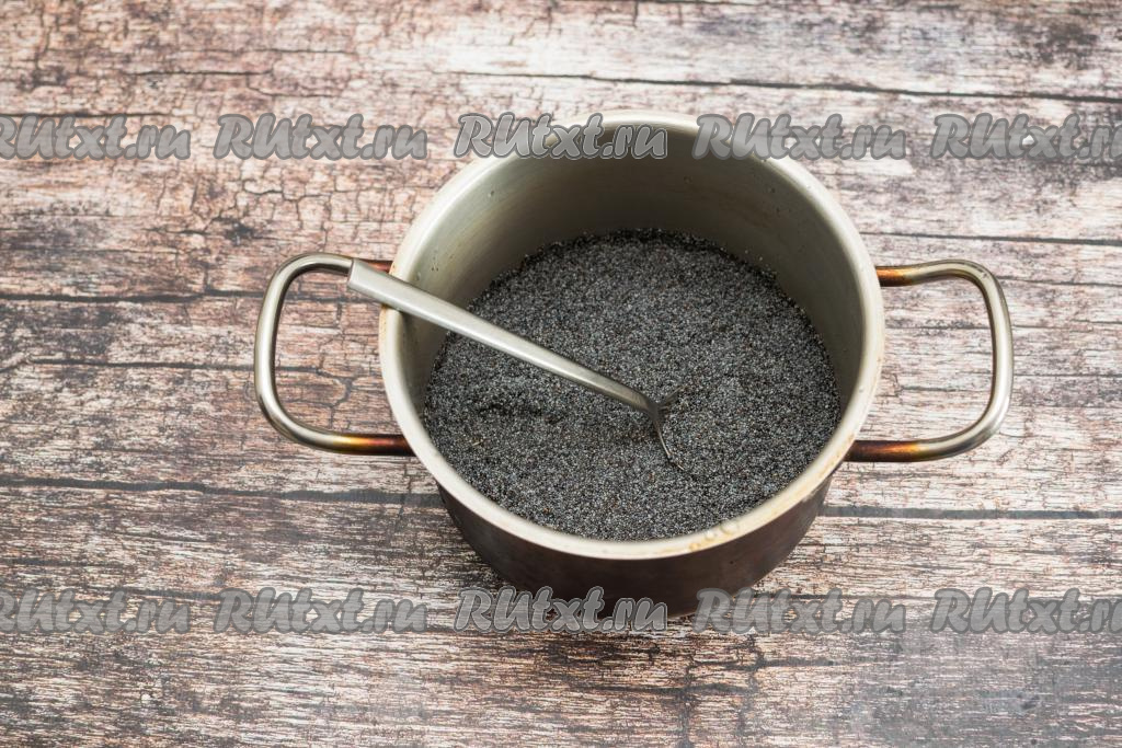 Как только достали дрожжевое слоёное тесто из морозилки, можно сразу начинать заниматься маковой начинкой для кулича. Для этого в небольшую кастрюлю с толстым дном нужно всыпать мак, влить 300 миллилитров воды, перемешать и поставить на сильный огонь.
