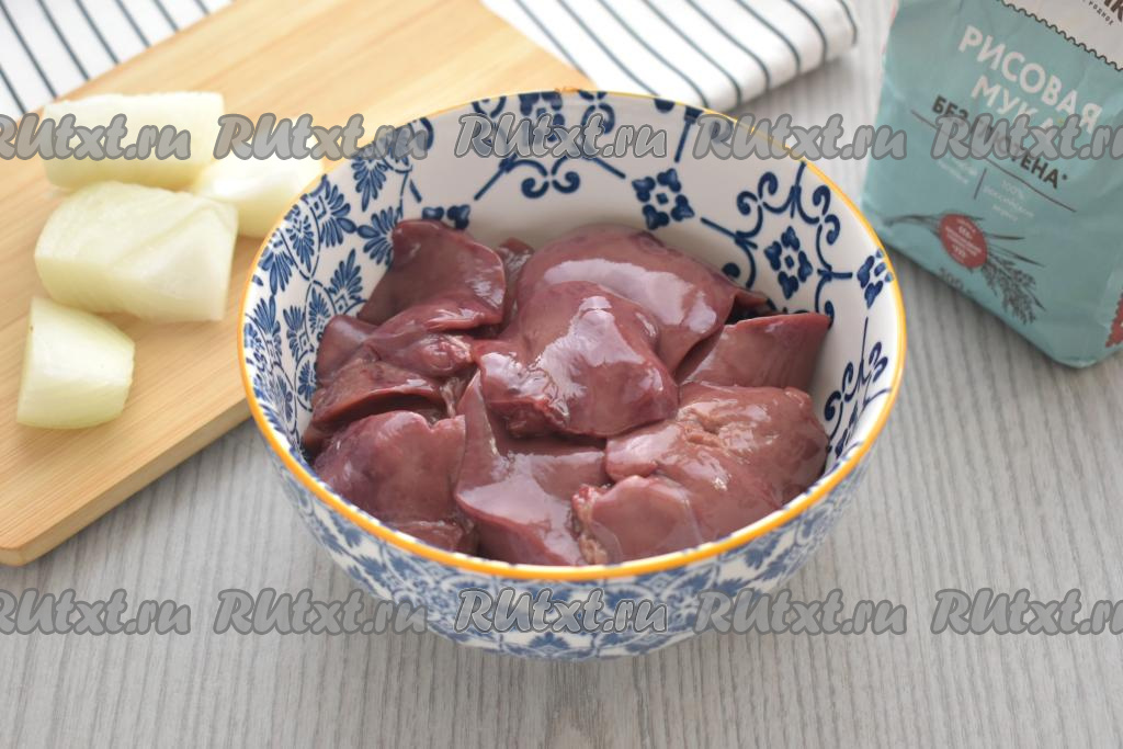 Куриную печень моем, отрезая, если они есть, прожилки. Лук очищаем, нарезаем на части.