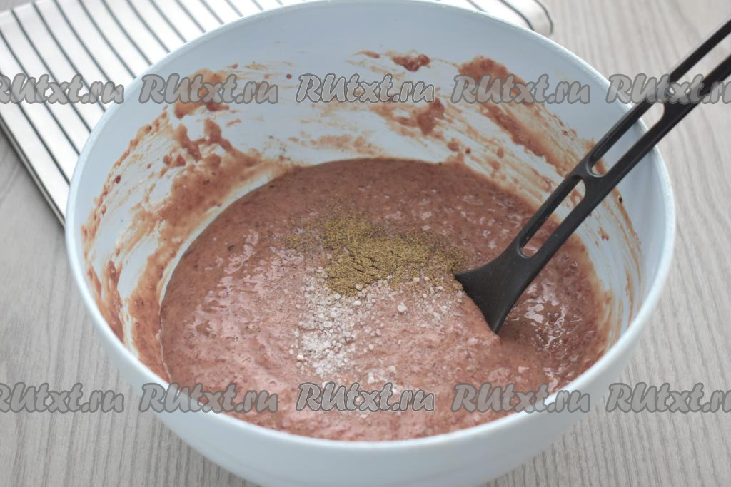 Получившийся печёночный фарш для оладий по вкусу солим и перчим, снова перемешиваем.