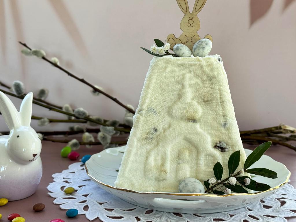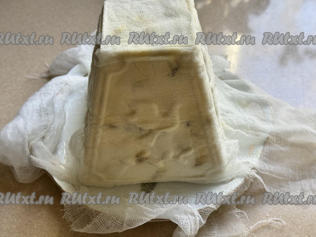 На следующий день достать пасочницу из холодильника, убрать гнёт и края марли, закрывающие основание пасхи. Перевернуть пасху на тарелку, снять створки пасочницы и убрать марлю.