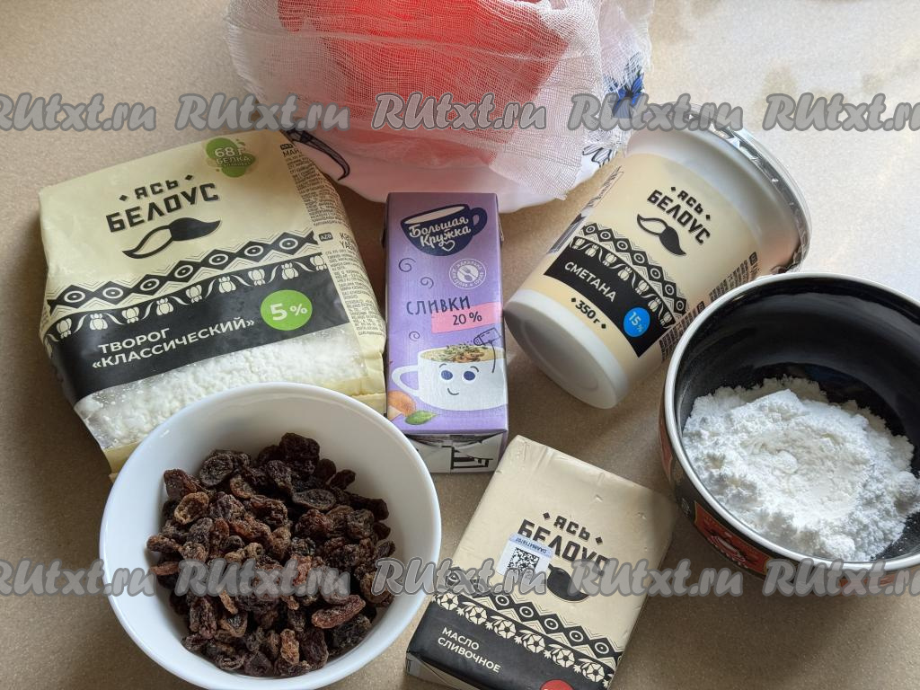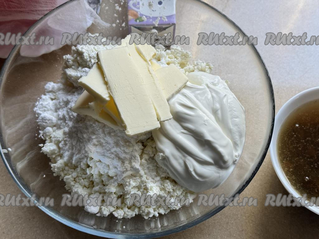Подготовить продукты. Творог можно взять любой жирностью (я купила жирностью 5%). Сметану лучше всего взять жирностью 15-20% (я использовала жирностью 15%). Сливочное масло нужно заранее достать из холодильника, чтобы оно стало мягким, согревшись при комнатной температуре.