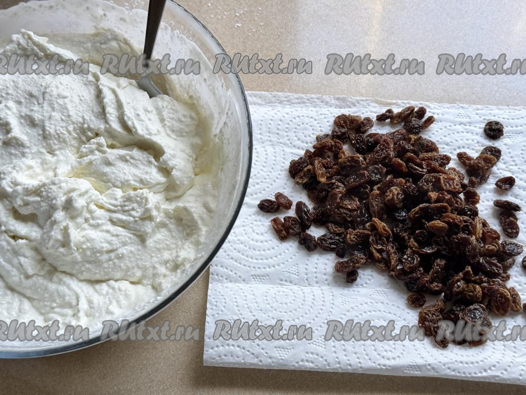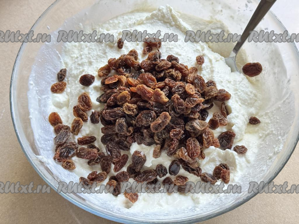 В миску с творожно-сливочной массой добавить обсушенный изюм.