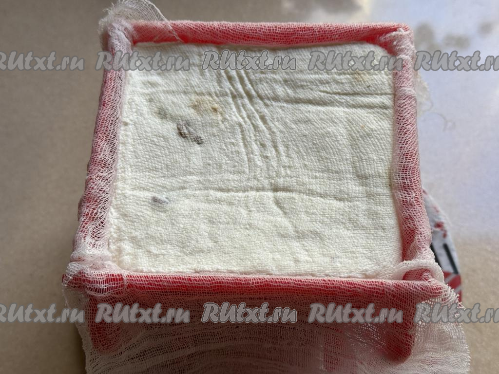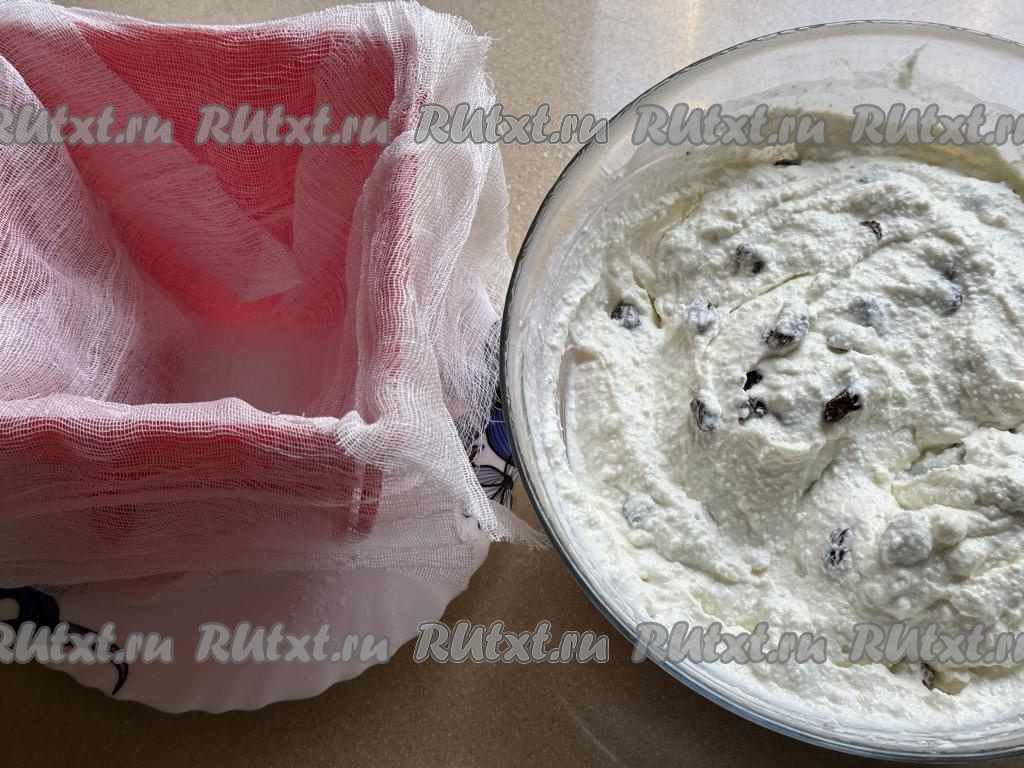 Перемешать творожно-сливочную массу, равномерно распределяя изюм. Пасочницу (я взяла пасочницу высотой 12 сантиметром, с квадратным основанием со стороной 12 сантиметров) застелить марлей так, чтобы концы марли свисали с краёв формы.