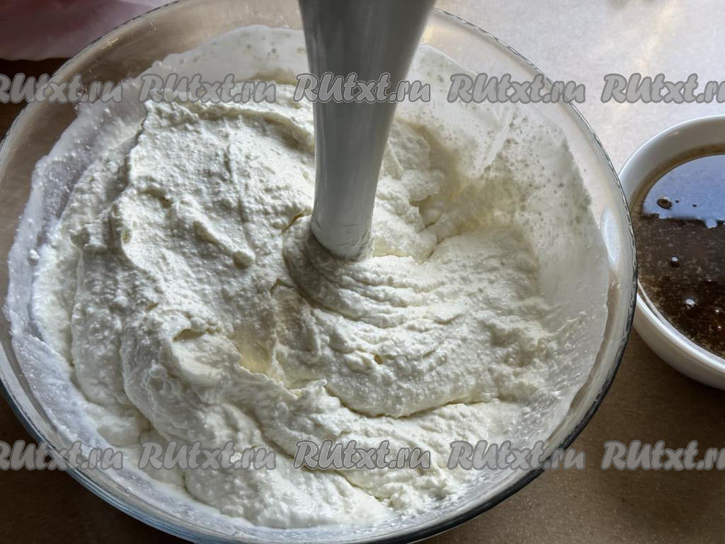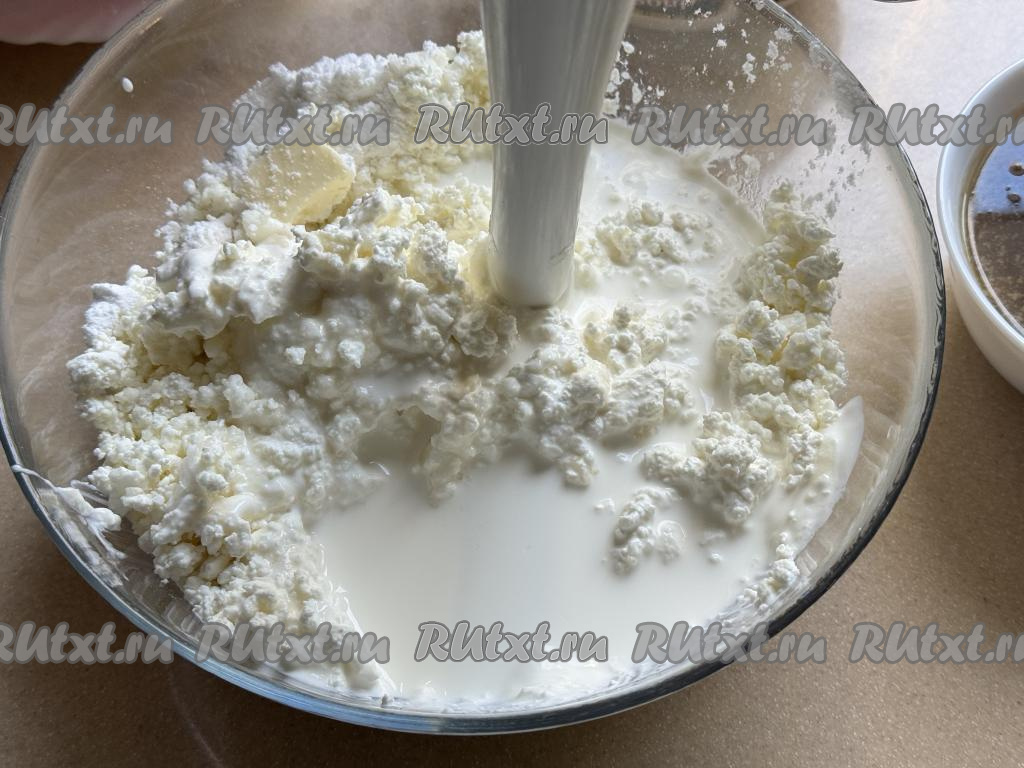 В достаточно глубокой миске, в которой в дальнейшем будет удобно взбивать погружным блендером, нужно соединить творог и сахар (или сахарную пудру).