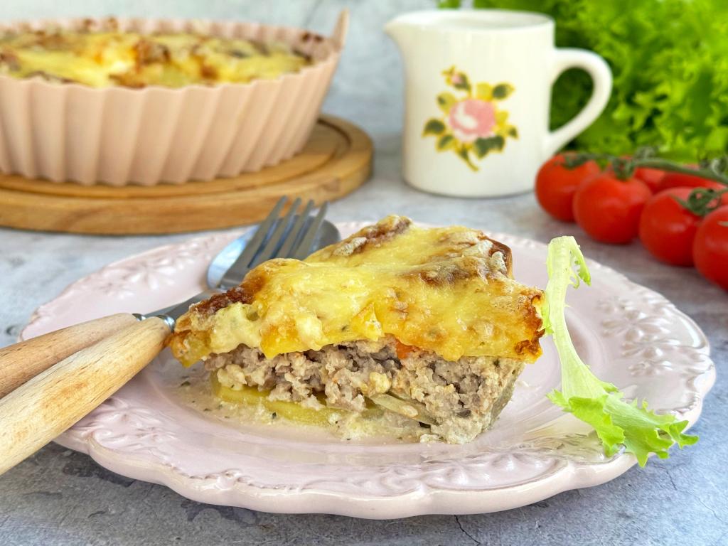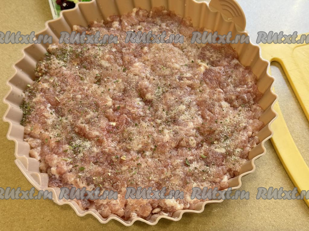 Затем поверх картошки и лука выложить ровным слоем подсоленный мясной фарш, немного утрамбовать его, можно тоже немного поперчить (или приправить другими любимыми специями).