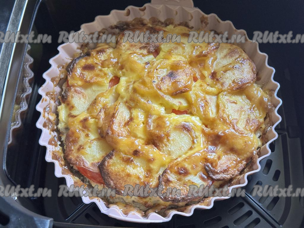 Форму с аппетитной картошкой, приготовленной по-французски с фаршем, достать из чаши аэрогриля.