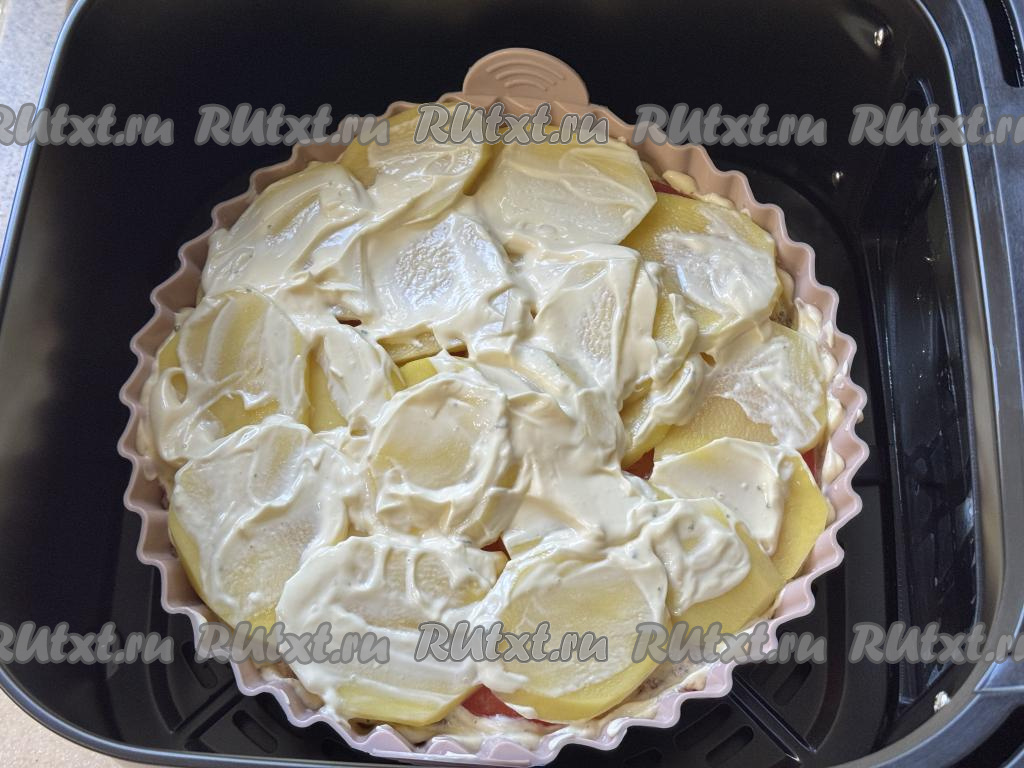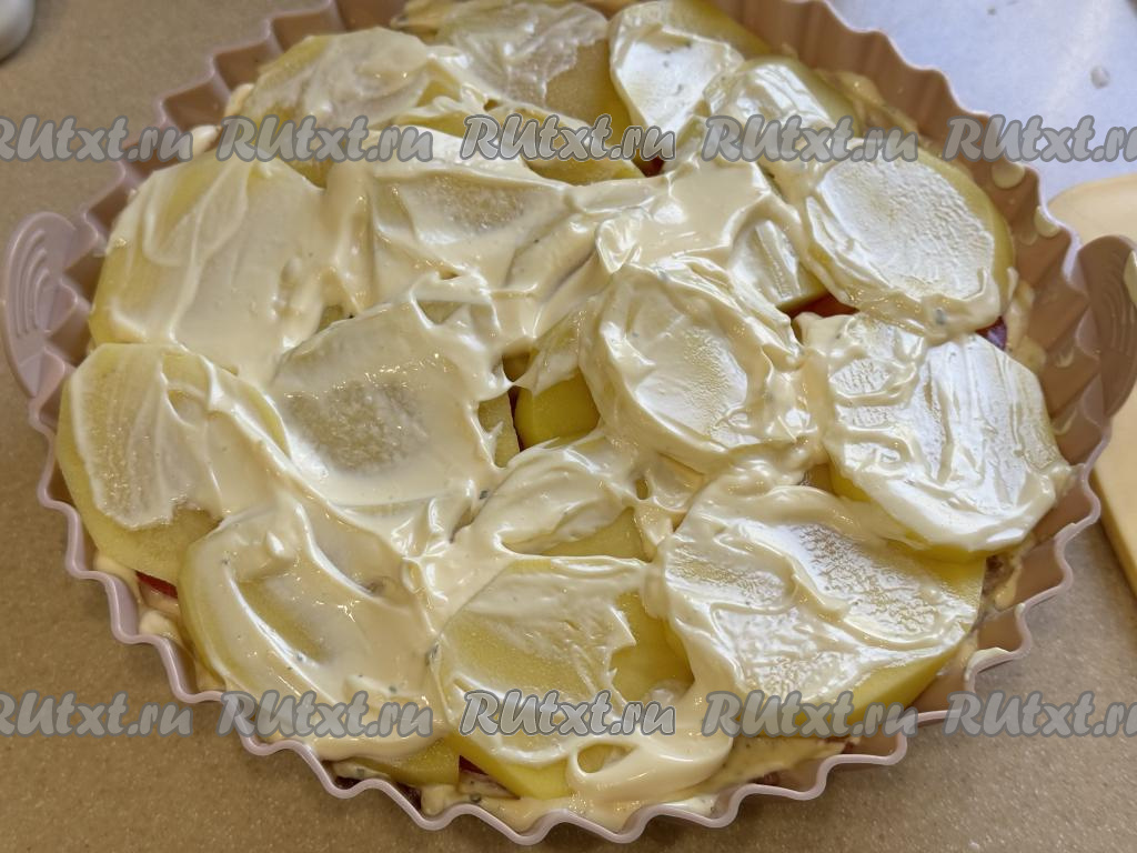 Равномерно поверх помидоров разложить оставшуюся картошку, немного поперчить, смазать сверху майонезом, покрывая весь картофель.
