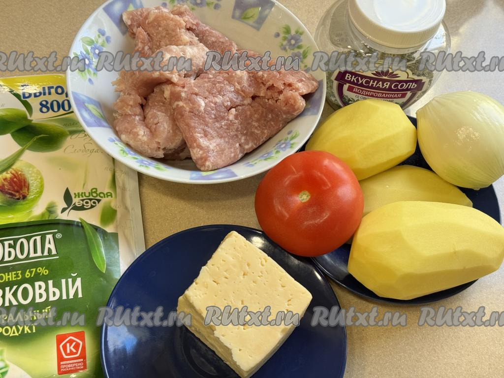 Подготовить продукты. Фарш можно приготовить в домашних условиях, пропустив кусочки любого мяса (у меня - свинина) через мясорубку, но можно использовать и фарш, купленный в магазине. Фарш слегка подсолить. Картошку и лук почистить. Помидор вымыть.