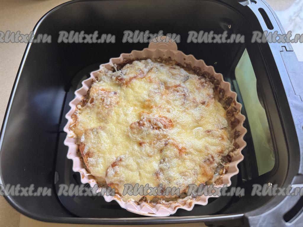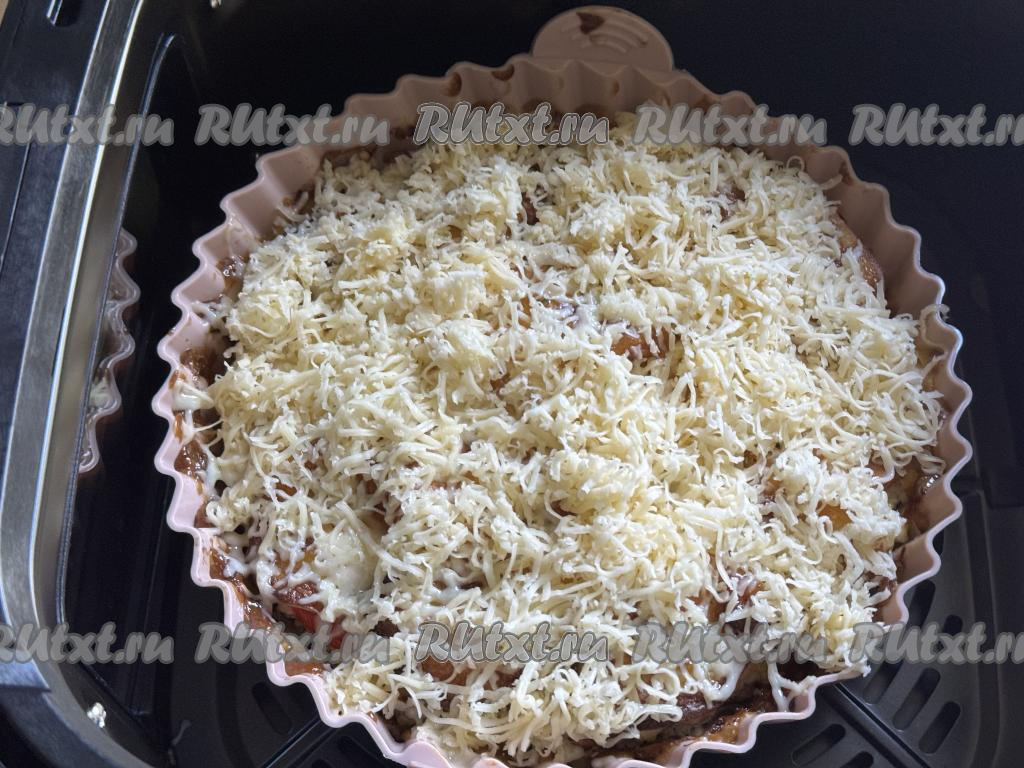 Затем достать чашу из аэрогриля, картошку по-французски с фаршем присыпать сыром, натёртым на мелкой тёрке. Отправить чашу в аэрогриль ещё на 10-15 минут.