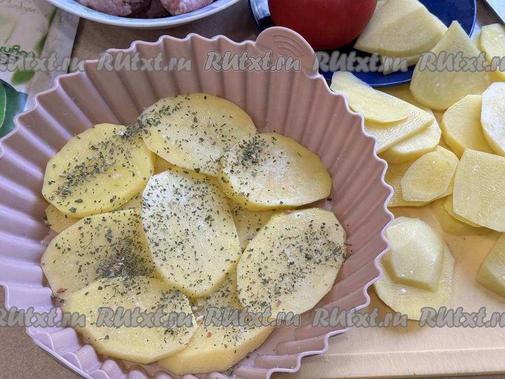 Картошку нарезать на тонкие ломтики (толщиной примерно 3-4 миллиметра), посолить, перемешать. Выложить половину нарезанной картошки на дно силиконовой формы, поперчить по вкусу (или добавить другие любимые специи).