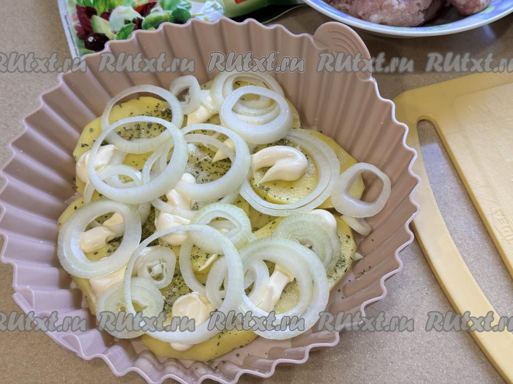 Смазать картошку майонезом. Лук нарезать на достаточно тонкие кольца, выложить поверх картошки.