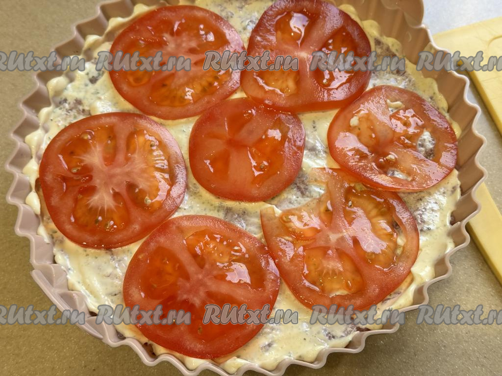Помидор нарезать на кружочки и выложить поверх фарша в один слой.