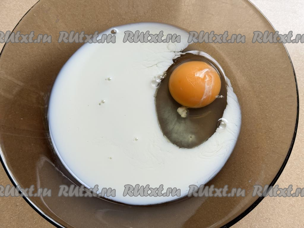 Для начала приготовим кляр, для этого в миске нужно соединить молоко, соль и сырое яйцо.