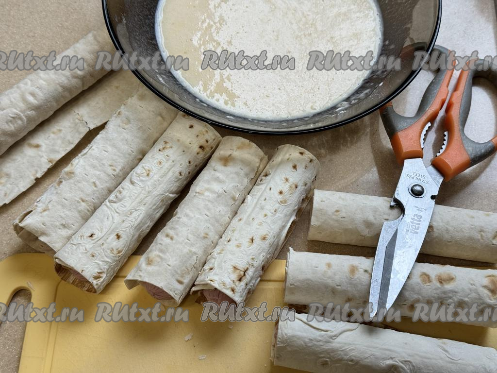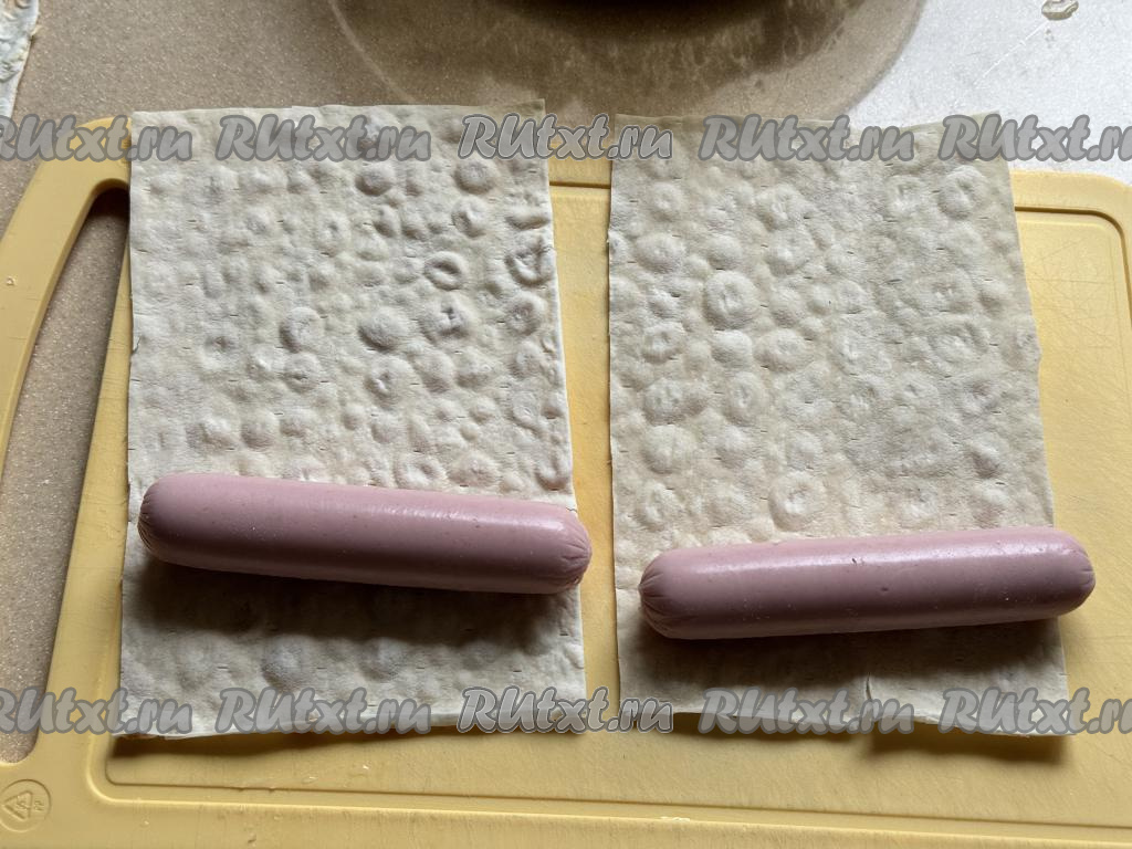 Завернуть сосиски в прямоугольники из лаваша, начиная с более узкого края.