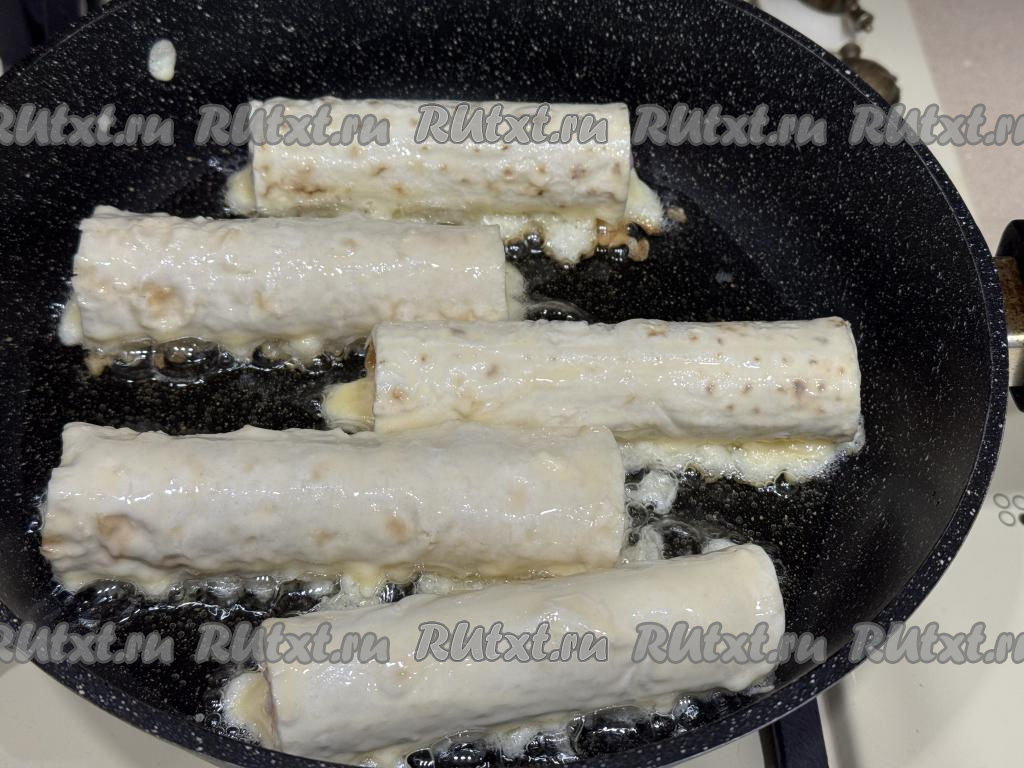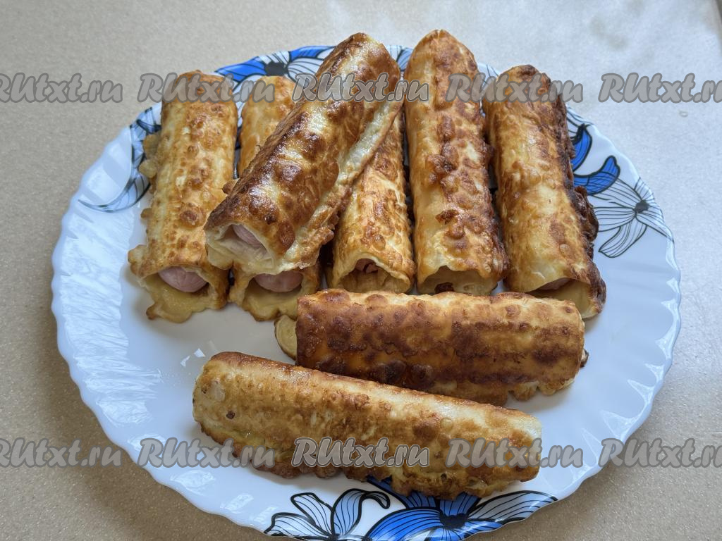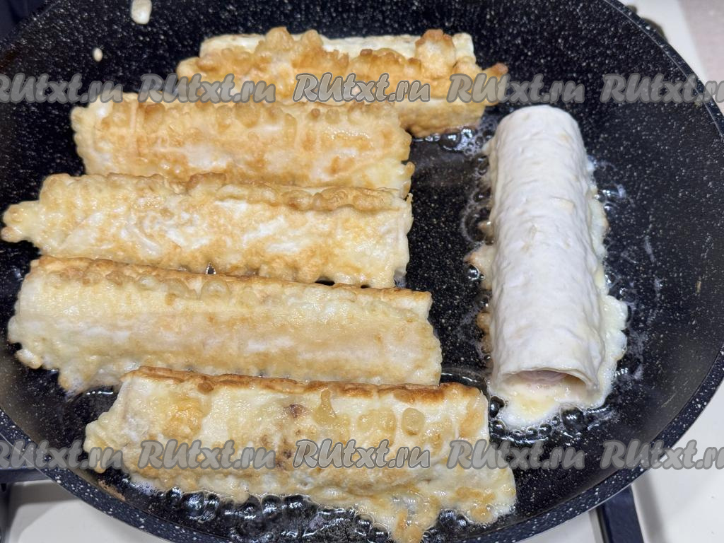 Готовые сосиски в лаваше перекладывать на тарелку и сразу жарить следующую партию.