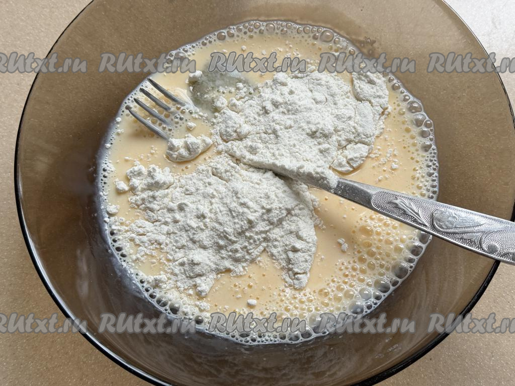 Взбить яйцо с молоком и солью вилкой до однородности. Затем небольшими порциями начать добавлять муку, каждый раз хорошо вмешивая её, чтобы не оставалось комочков муки. Итоговый кляр должен быть однородным, напоминающим по консистенции негустой кефир.