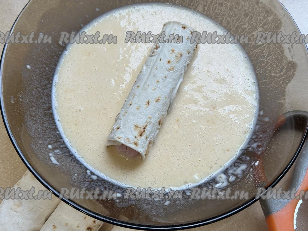 В сковороде разогреть растительное масло. Сосиску, завёрнутую в лаваш, окунуть в кляр. Прокрутить сосиску в кляре так, чтобы кляр полностью покрыл сосиску с лавашом, а затем сразу переложить на разогретую сковороду.