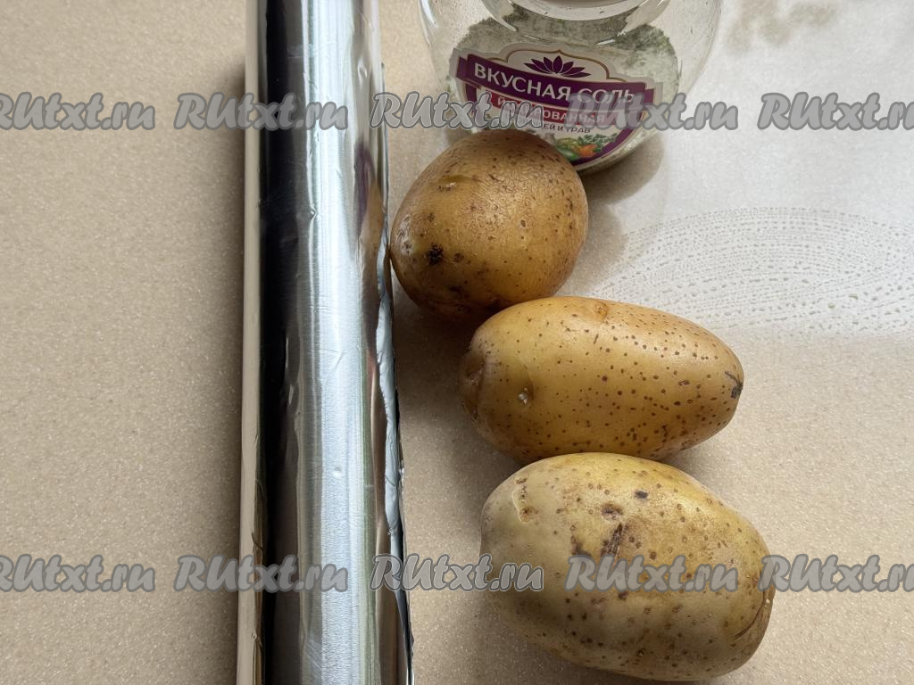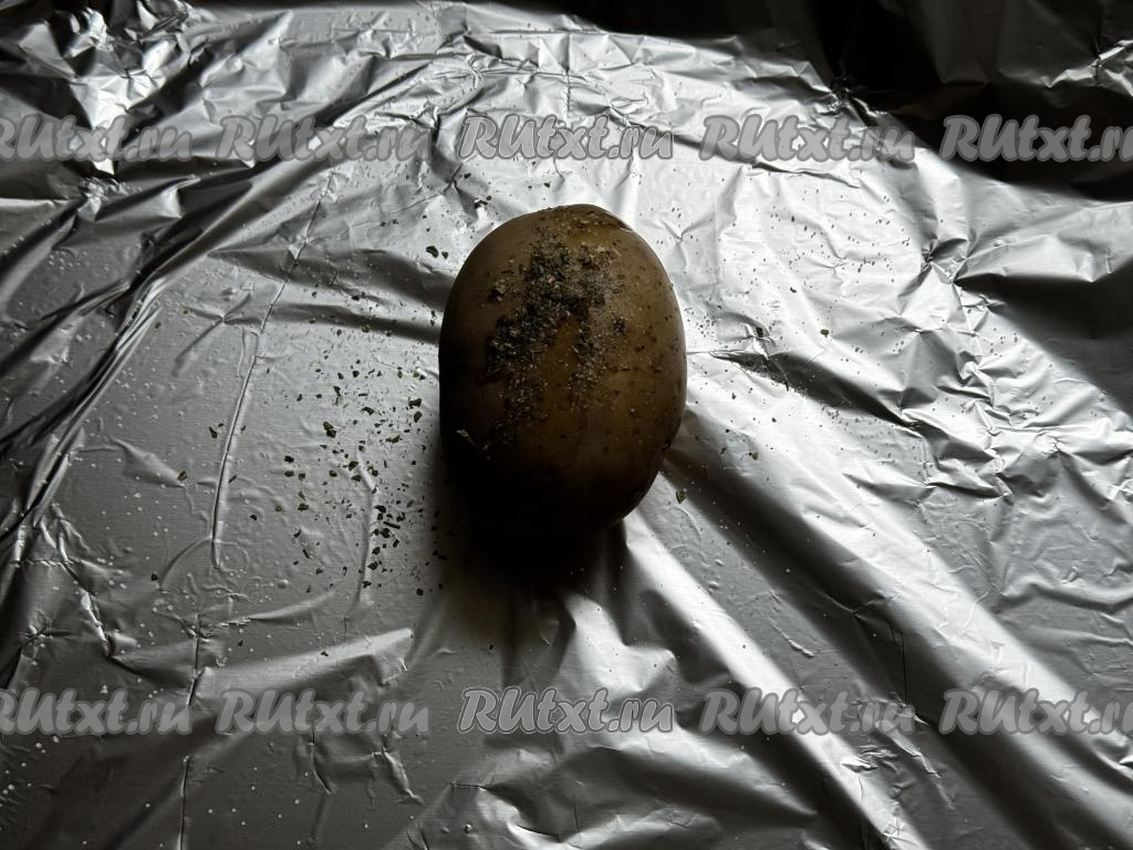 Каждую картошину выложить на отдельный лист фольги, при желании, если, например, планируете подавать картофель на гарнир, можно картошку присыпать солью. Я взяла пряную соль, смешанную со специями (в состав соли входят сушёная зелень и чеснок). Плотно завернуть каждую картошину в лист фольги.