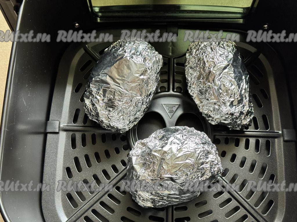 Каждый клубень картофеля, завёрнутый в фольгу, выложить на решётку в чашу аэрогриля. Можно запекать одновременно столько картошин, сколько у вас в один слой поместятся в чашу вашего аэрогриля. Я запекала 3 клубня.