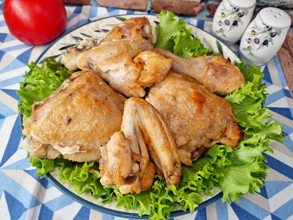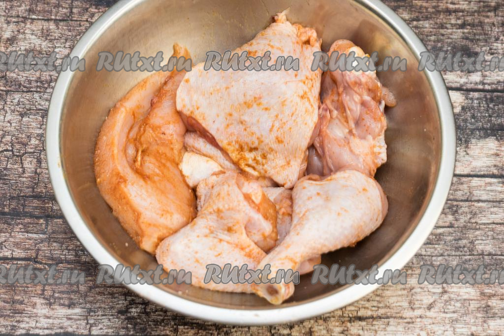 Порционные части курицы выложить в глубокую миску, посолить, приправить любимыми специями для мяса (я использовала специи для курицы и индейки). Тщательно перемешать, покрывая части курицы специями со всех сторон.