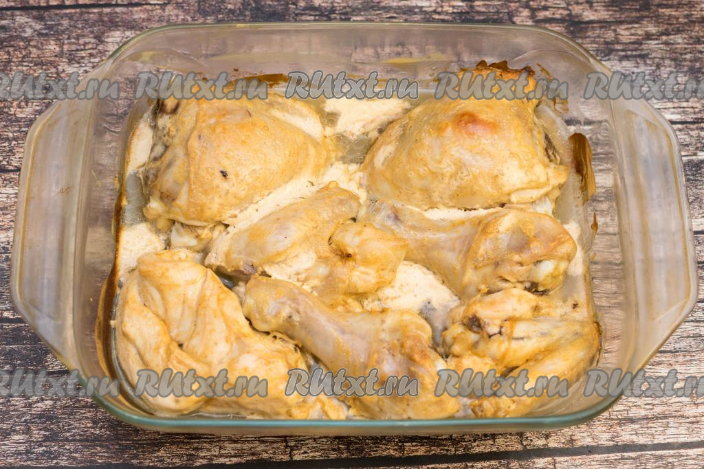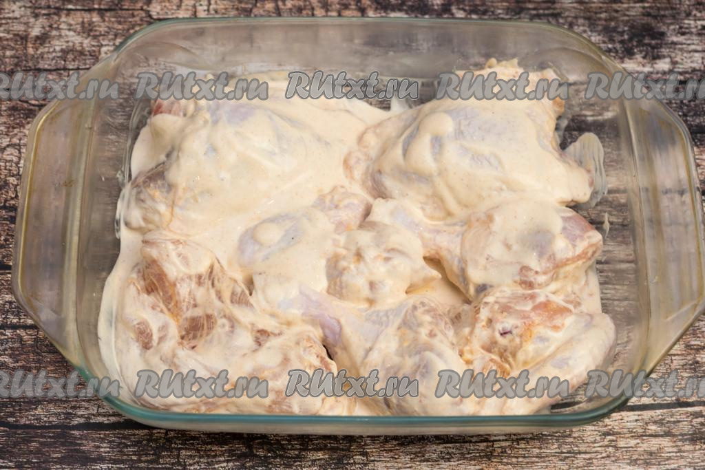 По прошествии 15-20 минут части курицы, замаринованные в греческом йогурте, выложить в один слой в форму для запекания, смазать мясо сверху йогуртом, оставшимся в миске, где мариновалась курочка.