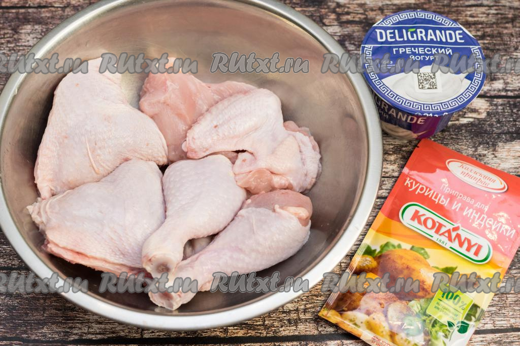 Подготовить продукты. Можно взять любые порционные кусочки курицы. У меня была целая тушка цыплёнка бройлера, я её промыла водой, обсушила, разрезала на порционные кусочки. Запекать в греческом йогурте я решила 2 крыла, 2 бедра, 2 ножки и 1 филе.