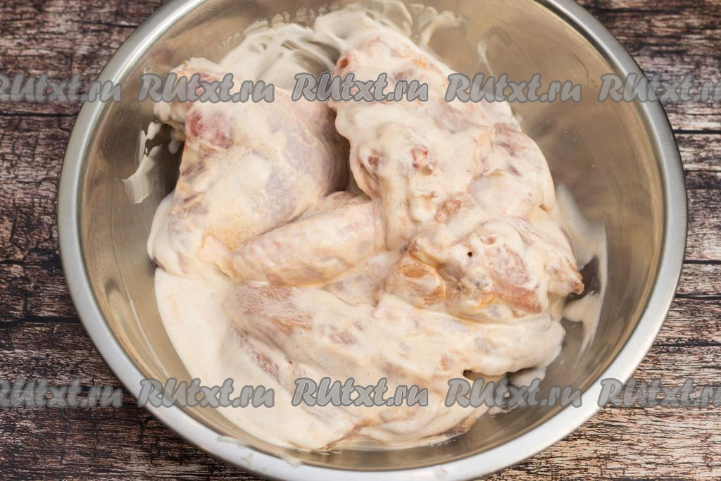 В миску с частями курицы выложить греческий йогурт. Хорошо перемешать, покрывая мясо йогуртом со всех сторон, и оставить мариноваться на 15-20 минут.
