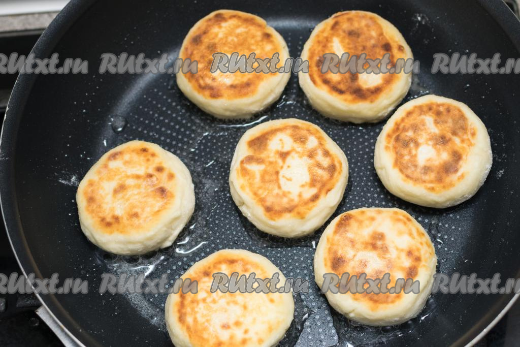 Сырники обжаренные снизу, перевернуть, сделать огонь чуть ниже среднего. Жарить сырники до румяности с другой стороны (примерно 3 минуты). Если после переворачивания сырников масла на сковороде осталось мало, тогда обязательно добавьте немного масла, чтобы сырники хорошо подрумянились и с другой стороны. Когда сырники подрумянятся и со второй стороны, их ещё раз нужно перевернуть, затем накрыть сковороду крышкой, выключить огонь. Дать сырникам потомиться под крышкой без огня в течение 5 минут.