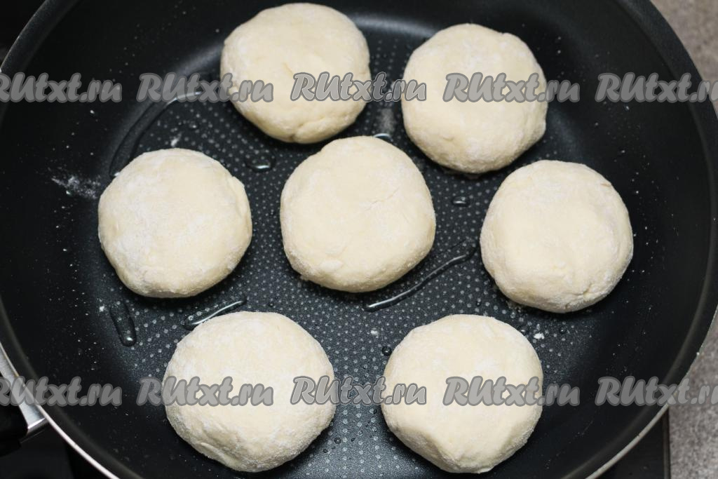 Сковороду хорошо разогреть с добавлением растительного масла. Выложить на сковороду сырники, жарить их на среднем огне в течение 2 минут (до подрумянивания снизу). Сырники при жарке очень любят растительное масло, поэтому его можно не жалеть. Именно жарка на масле придаёт сырникам аппетитную, румяную корочку.