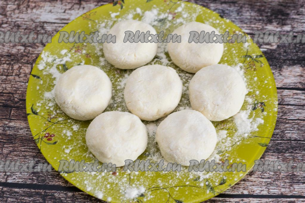 На припылённую мукой плоскую тарелку выложить все заготовки сырников, немного прижать их сверху ладонью, придавая им классическую форму.