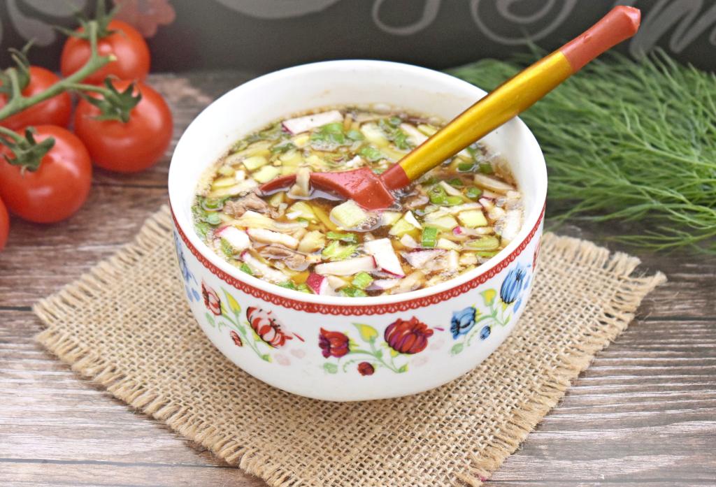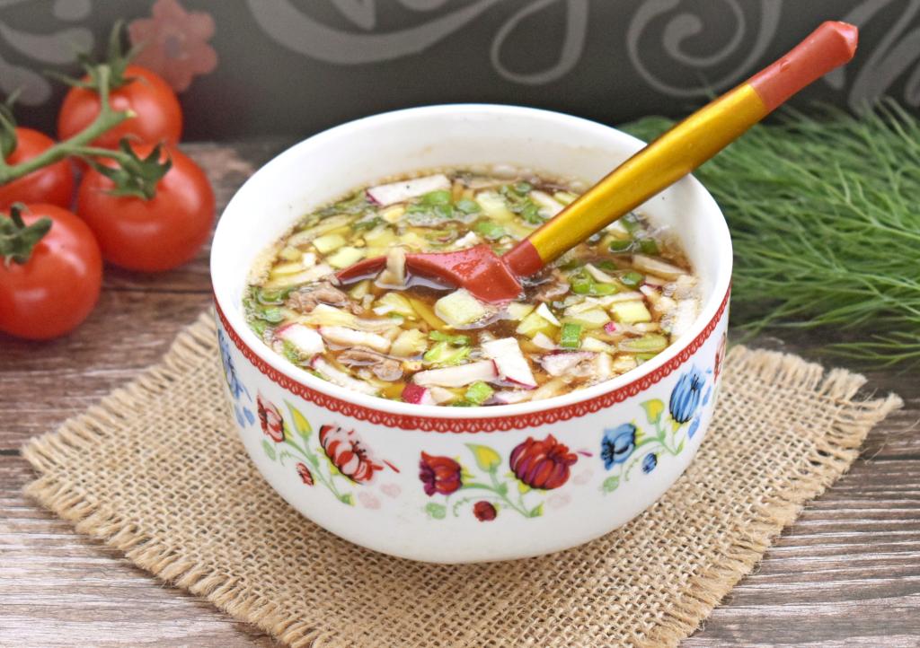 При желании в тарелку с окрошкой, приготовленной с говядиной на квасе, можно добавить сметану или горчицу. Это приятно освежающее блюдо и насытит, и приятно освежит в любой жаркий день.
