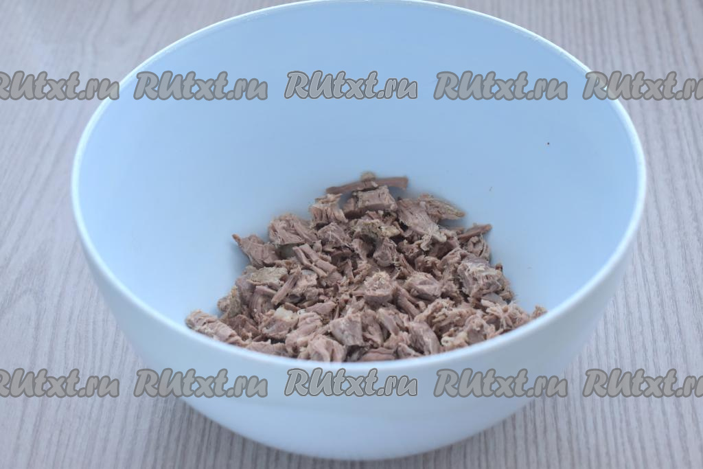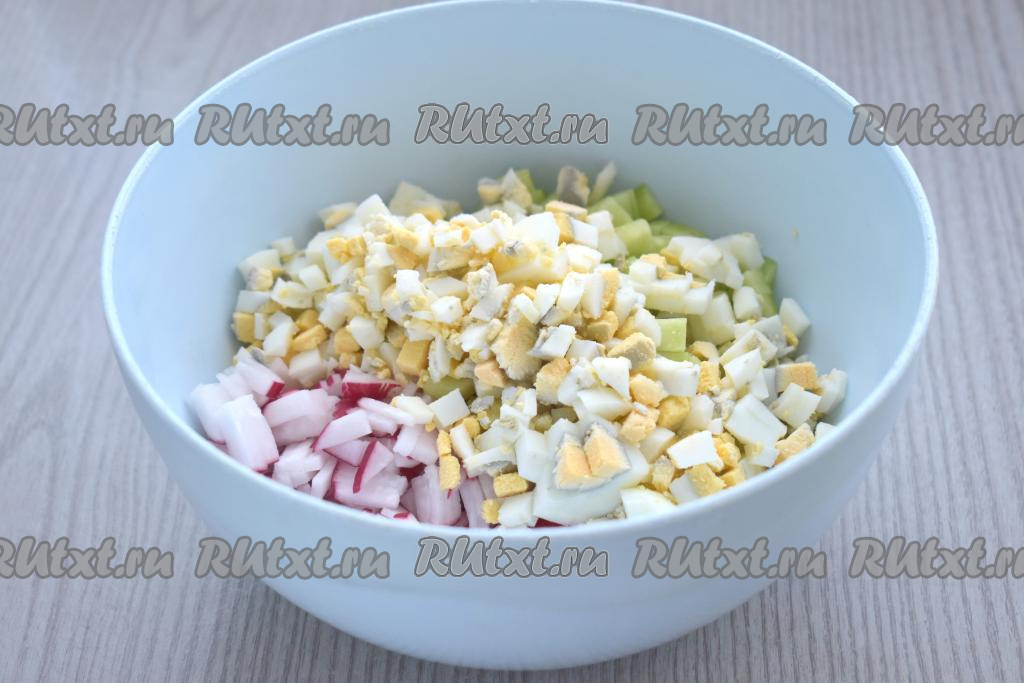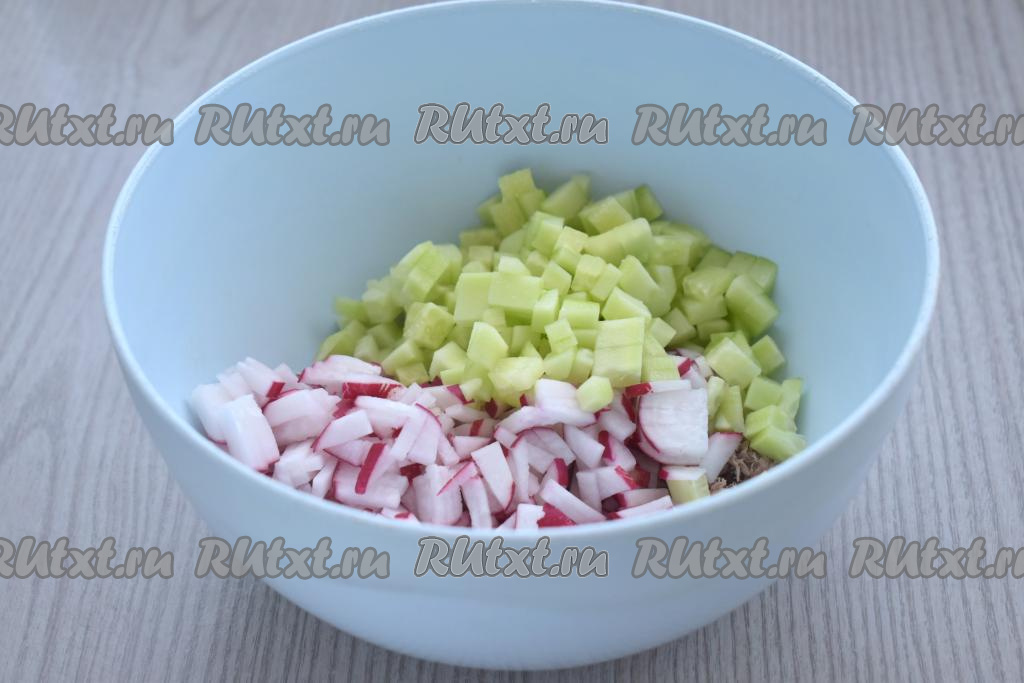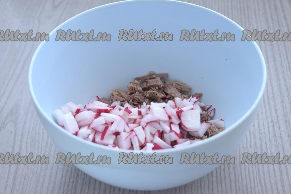 Редис моем, отрезаем хвостики с двух сторон. Нарезаем редиску на мелкие кубики, добавляем в миску с нарезанным мясом.